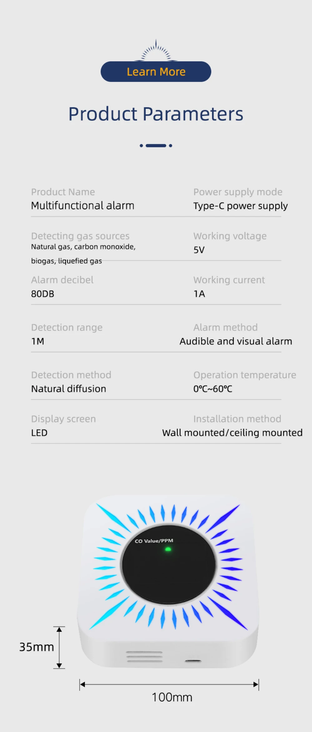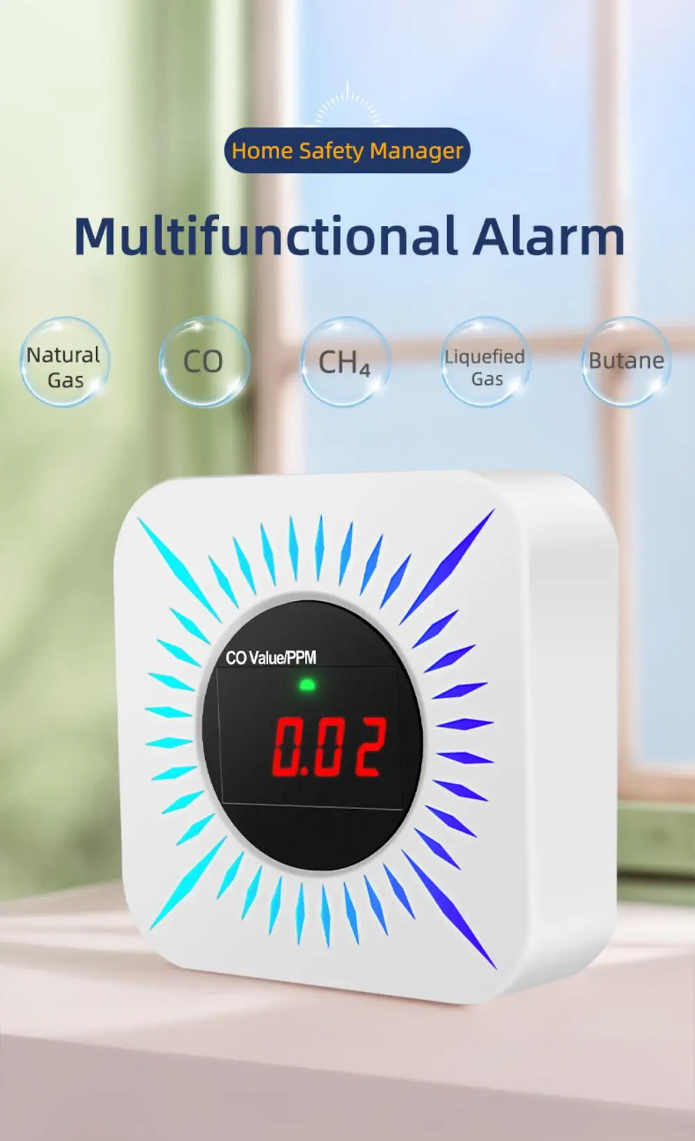 In addition to carbon monoxide detection, it can also detect natural gas, methane, liquefied gas, coal gas, biogas, etc.