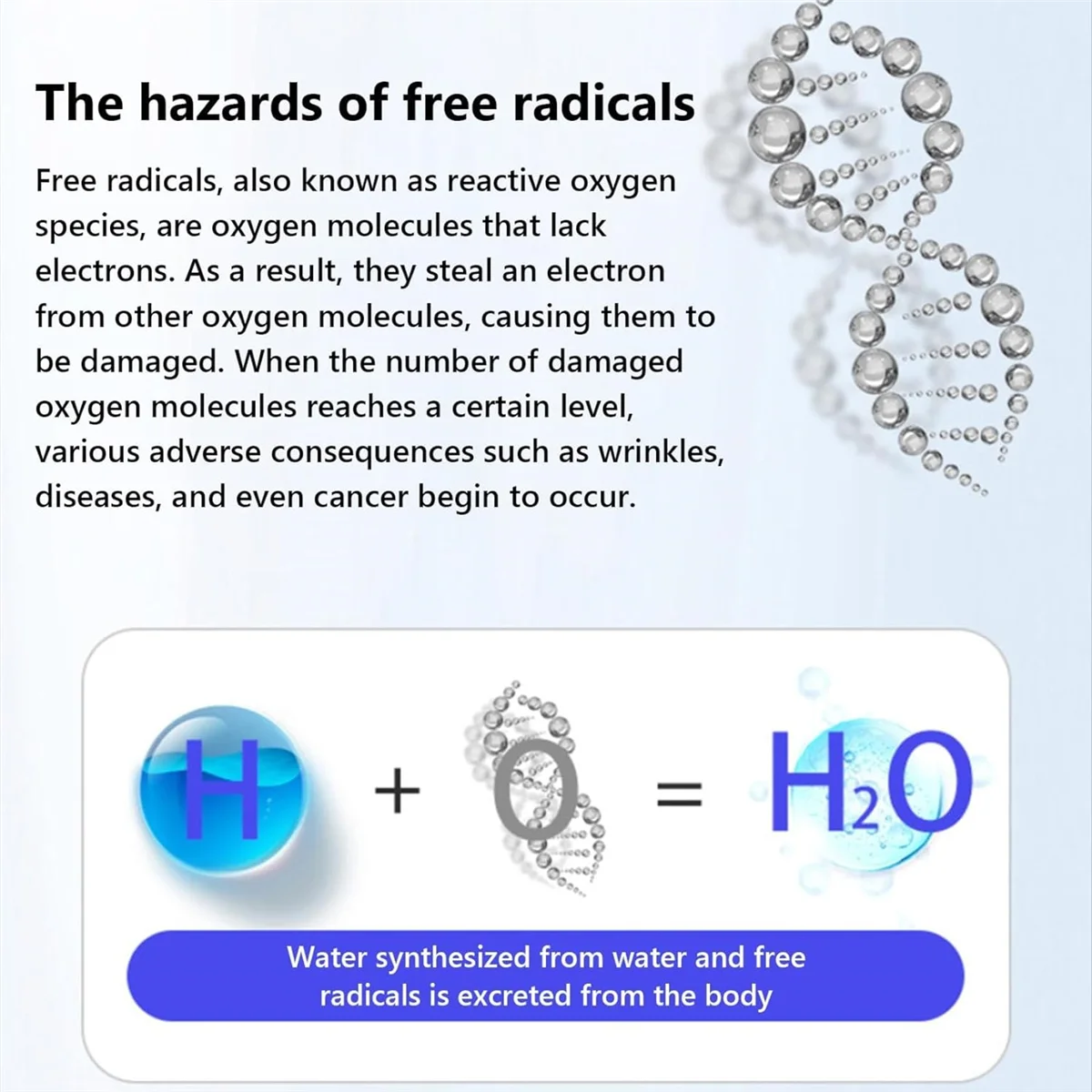 1.5L of water per day is equivalent to the antioxidant value of hundreds of Fruit and vegetables. Hydrogen-abundant water can reduce harmful self-free radicals, thereby reducing human aging and enhancing immunity. increases energy grade and slows down the process of aging.