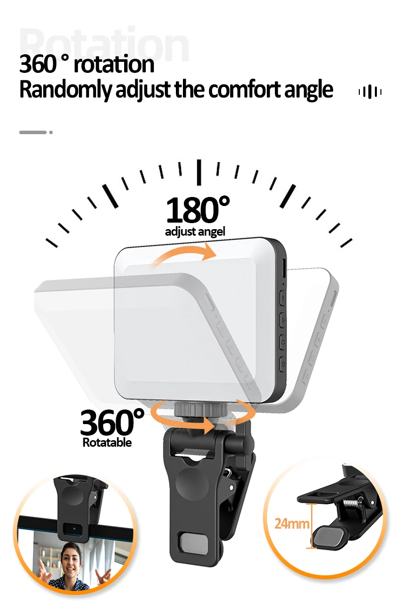 The selfie light has two kinds clip: front clip and back clip. With the front clip, the light can be adjusted 90 degrees and the mobile phone lens can be fixed to the lens fixing hole on the front clip for use. When using the back clip, the light can be fixed on the back of the mobile phone, which is used for mobile phone's rear camera shooting. It compatibles with various types of mobile phones or laptops, the clip design is not easy to fall.